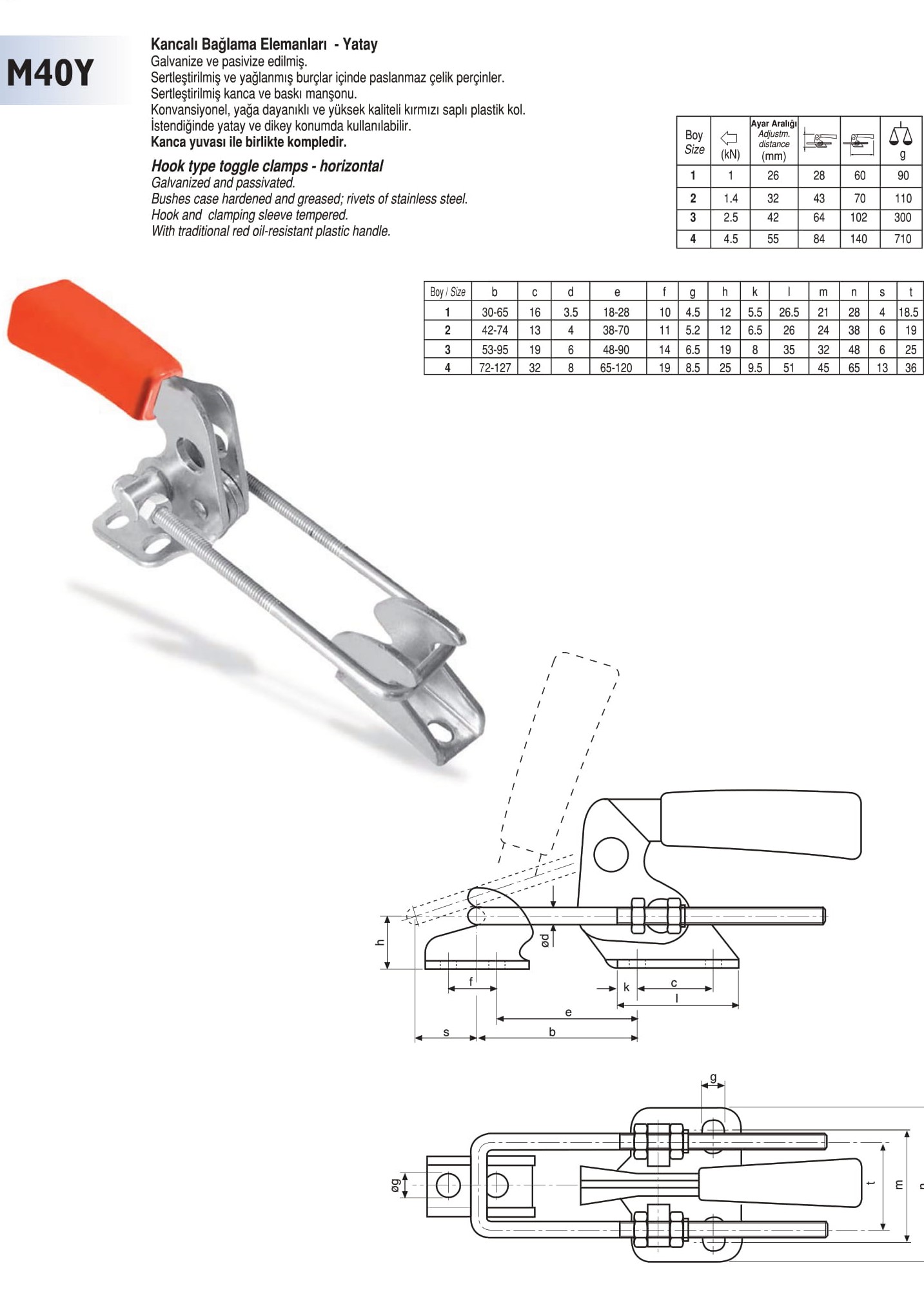 Yatay - M40Y Galvanize ve pasivize edilmiş. Sertleştirilmiş ve yağlanmış burçlar içinde paslanmaz çelik perçinler. Sertleştirilmiş kanca ve baskı manşonu. Konvansiyonel, yağa dayanıklı ve yüksek kaliteli kırmızı saplı plastik kol. İstendiğinde yatay ve dikey konumda kullanılabilir. Kanca yuvası ile birlikte kompledir.